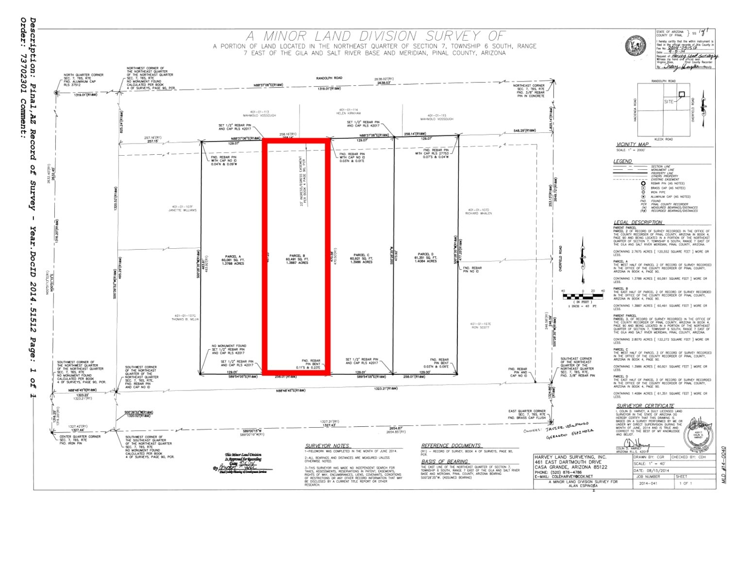 Legal Description: The East half of Parcel 2 of Record of Survey recorded in Book 9 of Surveys, page 40, also depicted as Parcel B of a Minor Land Division Survey recorded in Fee No. 2014-051512, records of Pinal County, Arizona