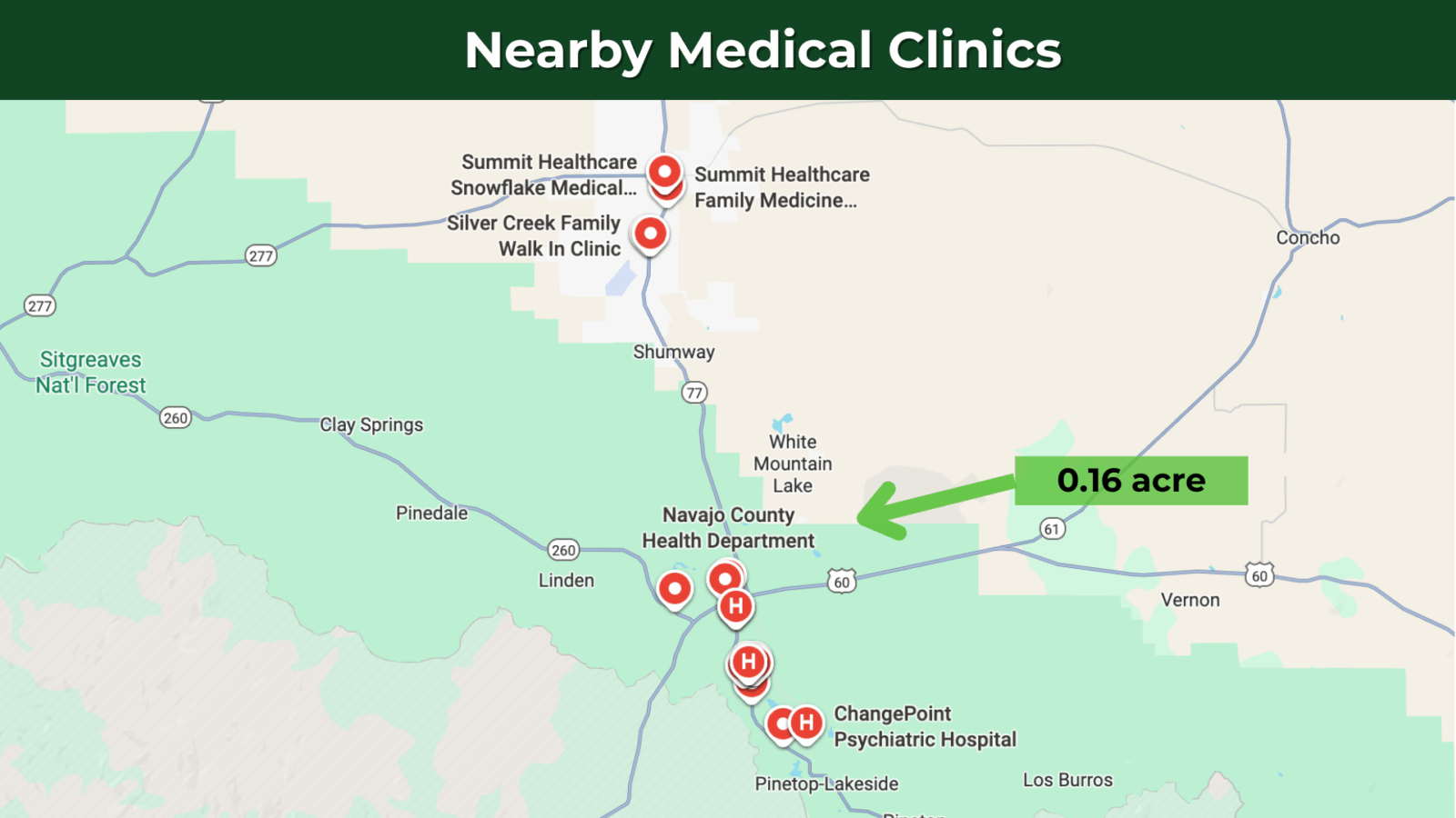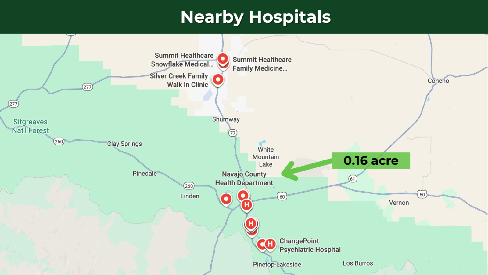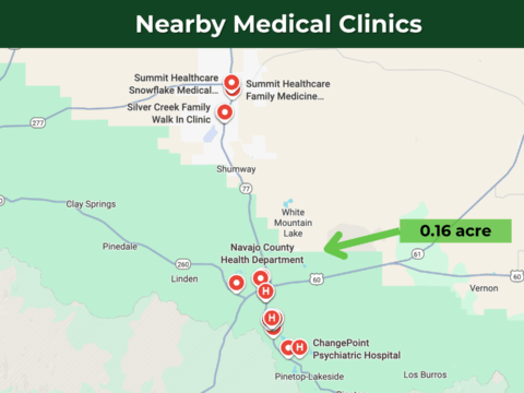 This lot is conveniently situated just 6 minutes from State Highway 60, ensuring effortless commuting, while Show Low Downtown is just 11 minutes away. It offers a wide range of necessities and services – including schools, hospitals, grocery stores, gas stations, Walmart, Safeway, McDonald’s, Dollar General, O’Reilly Auto Parts, pharmacies, and regional airports. Phoenix Sky Harbor International Airport is a 3-hour drive from the property.