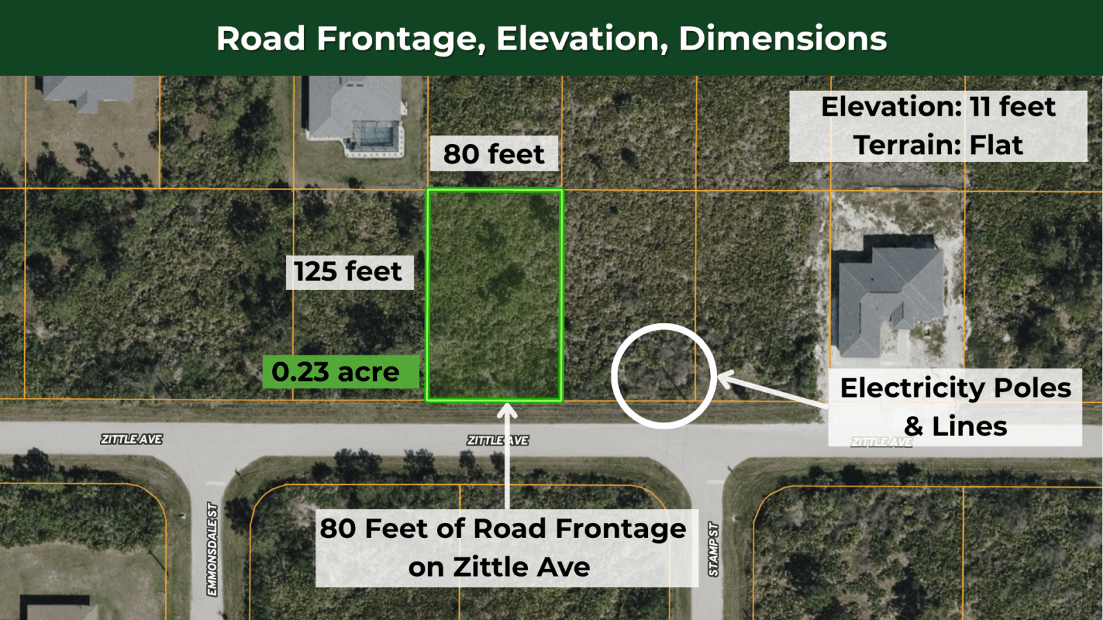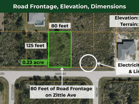 This 0.23-acre residential lot in Port Charlotte gives you a ready-to-build homesite with power just 76 feet away on Zittle Avenue. You can build a site-built home or place a manufactured home with the required wind rating—both are permitted under RSF-3.5 zoning. The lot sits level at 11 feet elevation, measuring a practical 80 x 125 feet with clear boundaries. County water runs nearby, and you’ll use septic for sewage. The quiet residential setting feels established but not crowded, with mature neighborhoods surrounding your future home location.