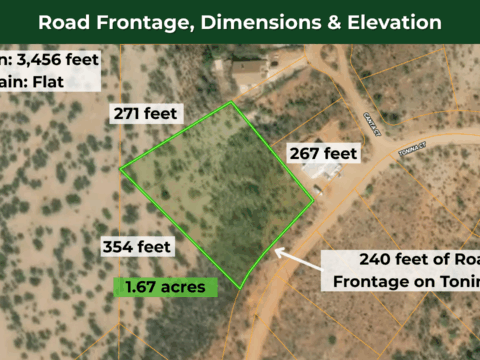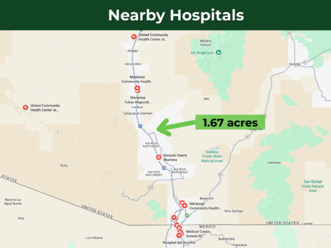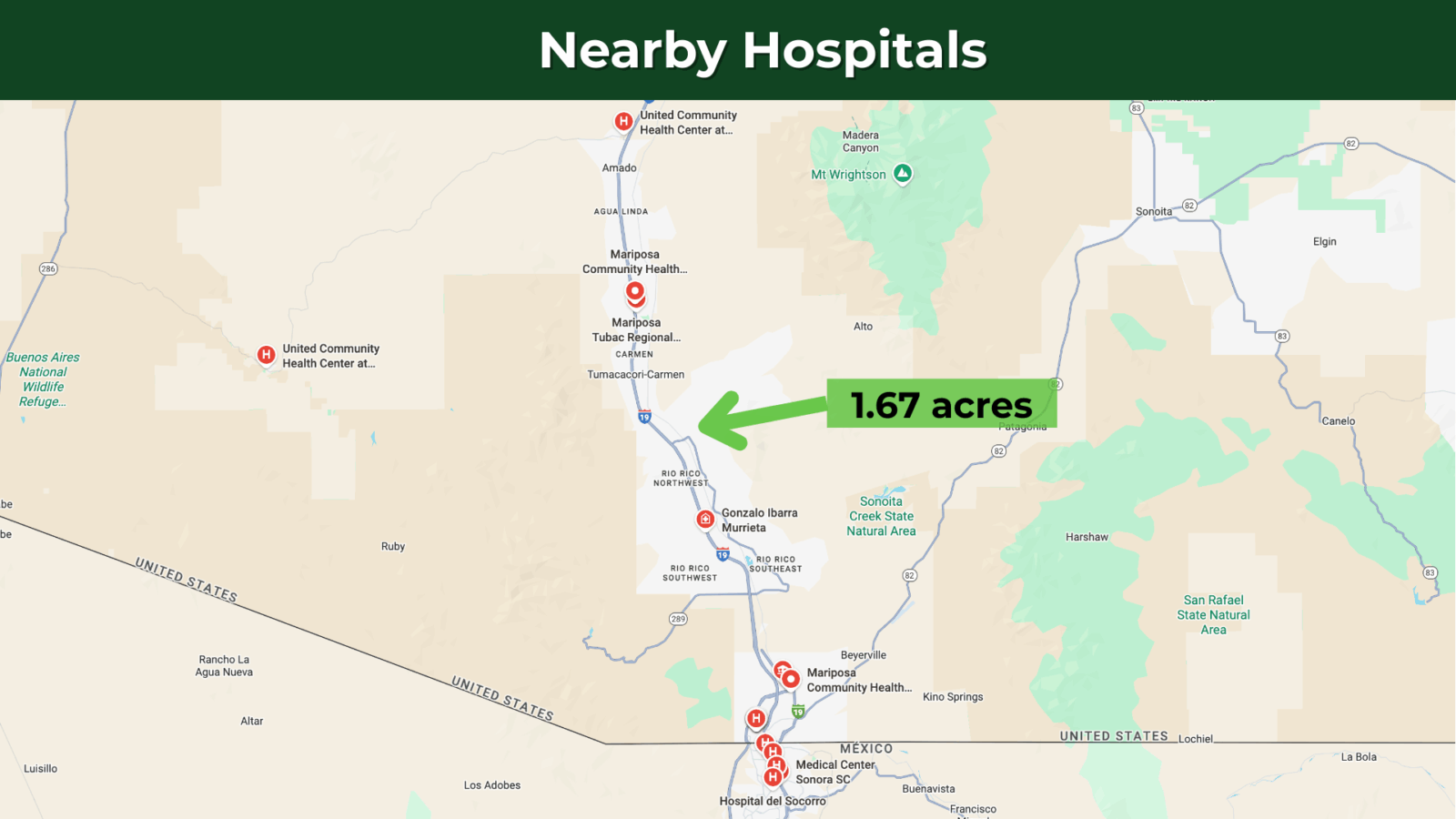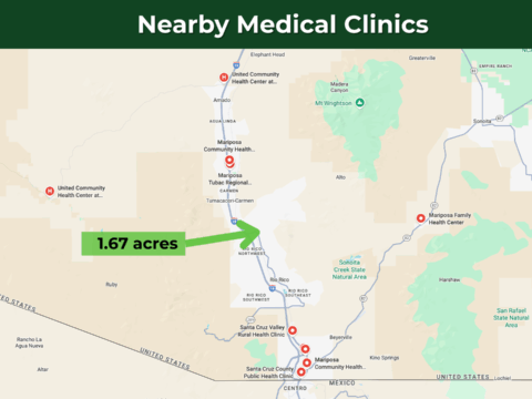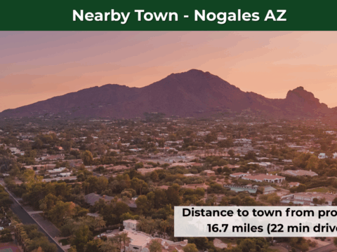 This lot is conveniently situated just 13 minutes from Interstate 19, ensuring effortless commuting, while Nogales is just 22 minutes away. It offers you a wide range of necessities and services – including schools, hospitals, grocery stores, gas stations, Walmart, McDonald’s, Dollar General, Napa auto parts, pharmacies, and regional airports. Tucson International Airport is a 48-minute drive from the property.